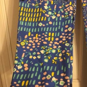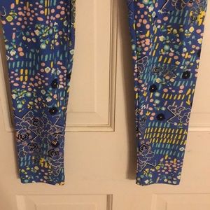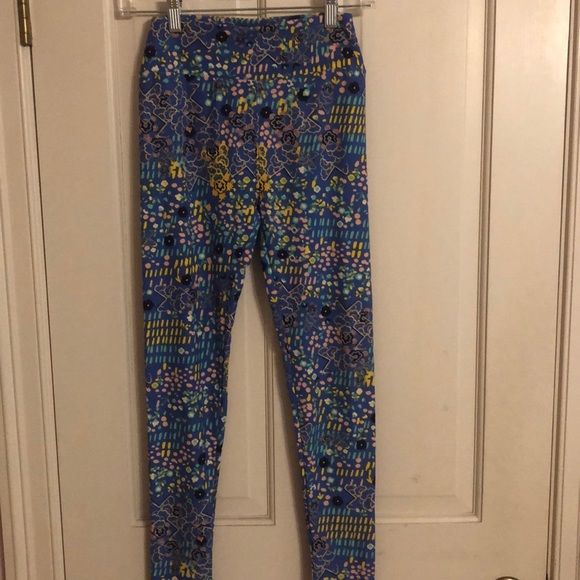 These Lularoe leggings are blue with pink yellow and navy and aqua they have only been worn two times and the fabric is so soft
