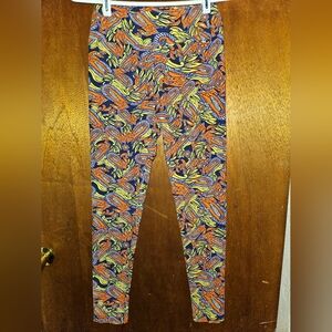 Lularoe leggings os. funky Paisley type print in bright orange, yellow, and lavendar on a dark background.