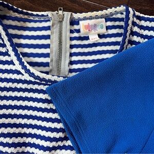 Three Lularoe Amelia dresses size XXS. Blue stripe, solid blue, and black and white striped. All great used condition