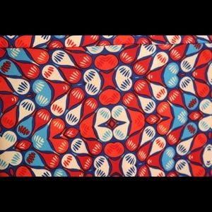 Love the Lularoe Azure skirt! It's a-line and hits me just below the knee. This one is a slinky material and is part of the Americana line released for 4th of July 2016. It's true to size but the slinky material isn't quite as forgiving as the leggings material around the mid-section. This skirt is new without tags. For an idea of how they look on, I'm wearing an Azure in my profile photo.