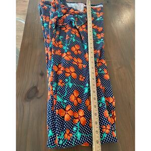 The Lularoe Anna Dress is a stylish and comfortable long dress perfect for the fall and winter seasons. This navy and white dress with orange floral accents features a round neck, mid sleeve , and a pullover closure for easy wear. Made from polyester, this dress is a size L and suitable for casual occasions. The colorful and floral design makes it a versatile and eye-catching piece to add to any woman's wardrobe.