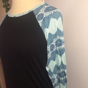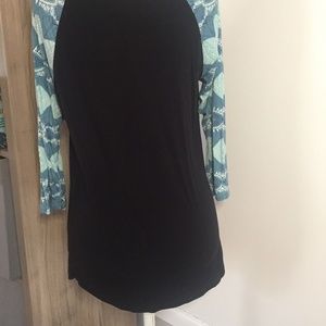 Solid black and cool blue tones. No signs of wear. 3/4 sleeve and rounded bottom hem . Relaxed fit
