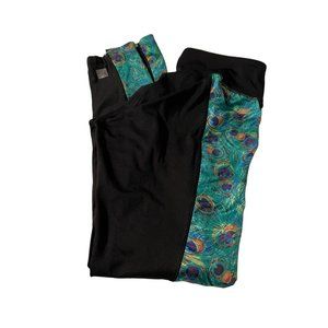 Lularoe Yoga Leggings pants. Black. Peacock Feather strips on outside of leg. Size M. Measures approx. 14" at the waist and inseam is 28". Great preowned condition