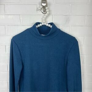 Good pre worn condition. Blue color. Lightweight knit style. Ribbed material. Has a mock / turtleneck depending on how high you like your collar fit. Great layering piece for the colder months. All sales final.