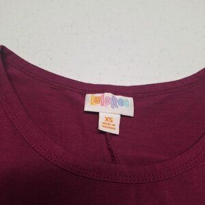 This Lularoe Burgundy Carly Dress features a tee shirt style with a front chest pocket, offering a casual yet chic look. Its knee-length design and comfortable fit make it perfect for various occasions. This XS size is ideal for petite frames.