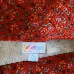 Lularoe Cassie pencil skirt size XL with great stretchy material. The color is red (slight burnt red with an orange undertone) with a blurred flower print of green and purple. Very pretty. Fantastic color. Worn only a few times.