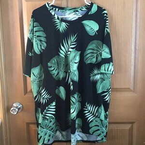 Lularoe Casual Shirt, Black with green flowers and leaves, front is longer than back, 3XL Short Sleeves, Rounded bottom, scoop neck, 95% Polyester 5% Spandex