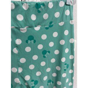 Disney leggings, Minnie Mouse, polka dot design, tall and curvy fit, stretchy leggings, green leggings, white polka dots, comfortable leggings, LuLaRoe leggings, machine washable polyester, spandex blend, elastic waistband leggings, casual wear leggi