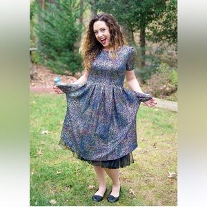 This dress is stunning! It is a Lularoe Amelia from the elegant collection. It is a rainbow mermaid metallic pattern that will look fabulous on anyone.