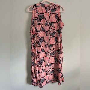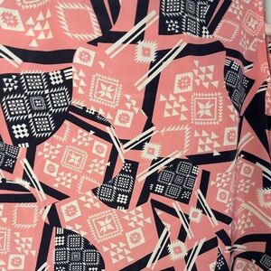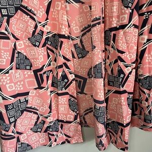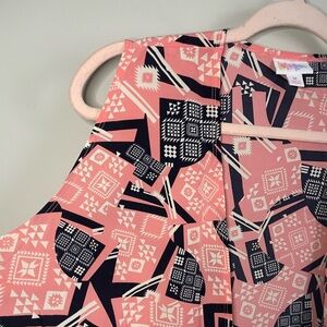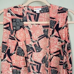 This floral Lularoe Joy longline vest is so cute! It is perfect to go over any outfit, and really looks great over dresses. The background is pink with a fun geometric pattern in white and black.