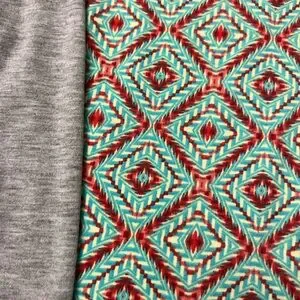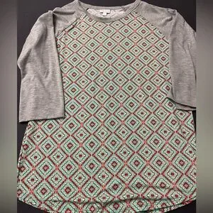 Vibrant LuLaRoe top with red and teal geometric design. Features gray accents for a stylish look.