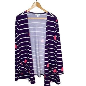 Lularoe HAPPY HEARTS Caroline * PURPLE PINK * WHITE Stripes M. Great condition! Ships fast! Smoke free home.
