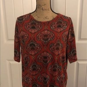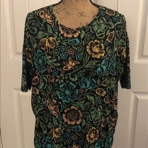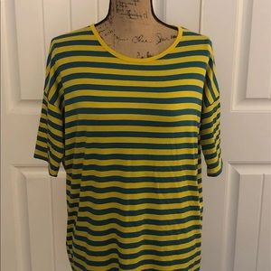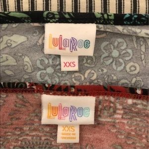 LuLaRoe Irma bundle of five in a size XXS. The first one is a burnt orange color background. The second is a black color background. Third is a stripe yellow and green blue color. Fourth is blue color background and the last one is black and white color. All are in really good condition! Retail value $175
