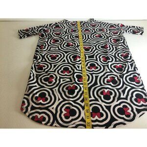 This Minnie Mouse tunic blouse by LuLaRoe features a colorful all-over print with adorable pink bows. The short-sleeve shirt has a scoop neckline and a relaxed fit, making it perfect for casual occasions. Made of a soft and stretchy blend of polyester and spandex, this top is comfortable to wear year-round. It comes in a women's size XXS and is part of the LuLaRoe Irma product line. The Minnie Mouse accents and Disney theme make this shirt a must-have for any Disney fan's wardrobe.