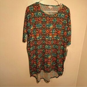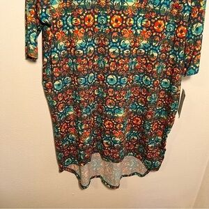 Great condition, new with tags. Lularoe. Irma tunic top. Crewneck. Elbow sleeves. High low hem. Blue with green, white, pink, red and orange geometric pattern. Size small. Stretch 96% polyester, 4% spandex. Pit to pit laying flat 26” Shoulder to hem 29”/34” Sleeve (pit to hem) 6”. All measurements are approximate and taken lying flat. Smoke free home. No trades, offers welcome.