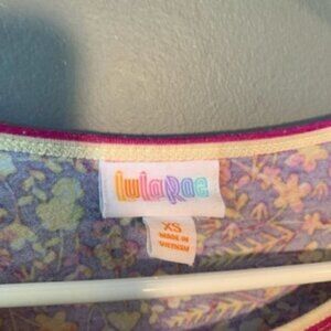 Great condition, minor wear. LulaRoe. Irma. Tunic top. Half sleeve. High low hem. Purple with yellow and pink multicolor floral on body. Cream and pink striped sleeves. Size XS. stretch 95% polyester, 5% spandex. Measurements available upon request. Smoke free home. No trades, offers welcome.