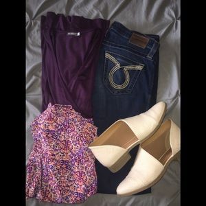 Size medium. Worn once. PERFECT condition. Gorgeous versatile pattern with purples orange and cream coloring.