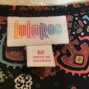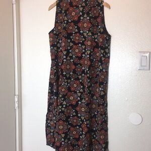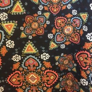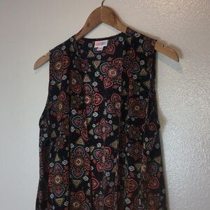 Lularoe Joy Sleeveless Vest Duster Black/brown Geometric Print with small amounts of turquoise and orange. Size M EUC 100% Polyester Flat lay pit to pit 22” Length 43”