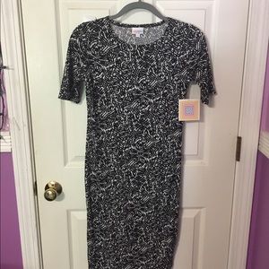 The dress I am selling is not the cover photo, that is just for fit. The one I am selling is the second picture. Never worn, perfect condition! 96%polyester, 4% spandex. New with tags!