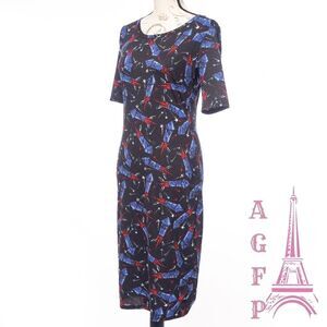 Women's patriotic stretch Short sleeves Firecracker fireworks independence Day novelty print black red blue Julia summer dress by Lularoe, size S, in excellent pre-owned condition