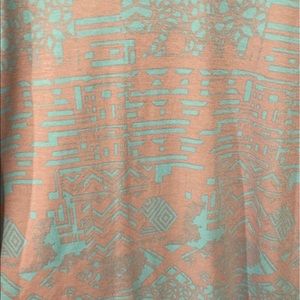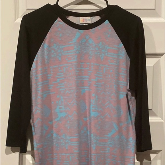 Large Randy. Fits TTS. Black sleeves with light coral and blue body. Worn 3x