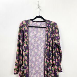 Lularoe Large Womens Unicorn Sarah Purple Rose Print Ribbed Long Cardigan