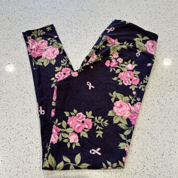 Lularoe Leggings OS Pink Roses Ribbon on Purple Breast Cancer Awareness BCA RARE UNICORN