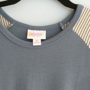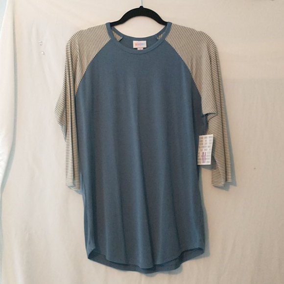 New with tags, a Medium Lularoe Randy. The body is blue and the sleeves are stripped with off white & blue. Smoke free home.
