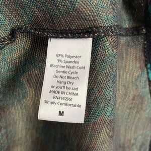 This Lularoe Madison is adorable. It’s a dark navy background with a floral pattern in mustard yellow, burgundy red, and teal. This is a super comfy and cute skirt style, and this one is specifically great for cooler weather. It is made from a think fabric than most others of this style, and the colors are great for a darker palate. It has pockets! There is a little piling by the pocket, which can be seen in the last photo.