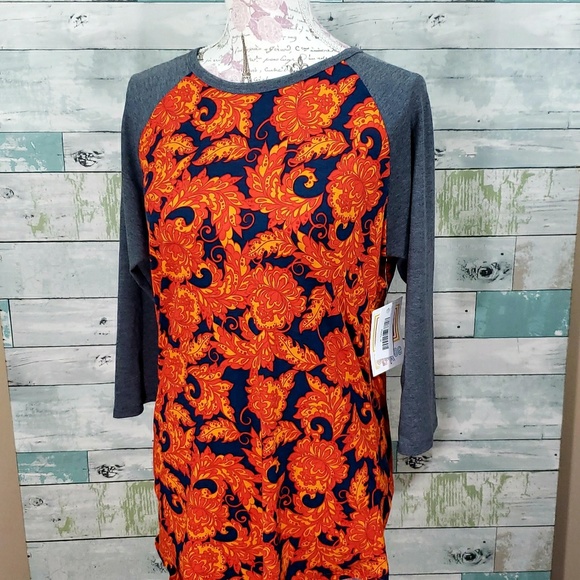New with tags med lularoe Randy tee. Blue/burnt orange paisley pattern on body with gray sleeves. True to size fit