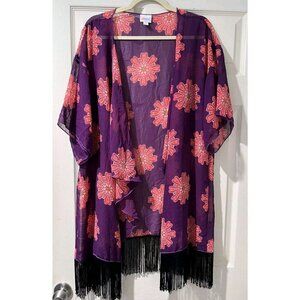 Lularoe Monroe Cardigan Kimono Fringe Black Purple Flower Print Size L