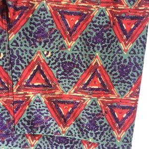 Lularoe OS leggings. Red and cream triangles with purple cheetah print. Jade green background. Worn and washed once per Lularoe instructions. Excellent condition.