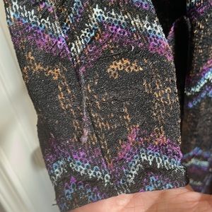 Gently used Sarah duster. Small snag on right arm. Black background with blue, purple, and brown chevron pattern.