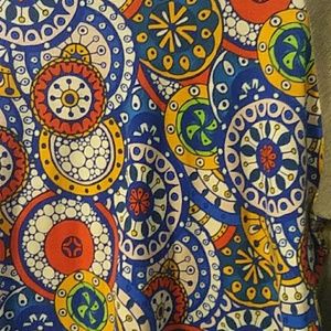 Randy baseball T. 3/4 sleeves, solid gray. Body has multicolor circles. Gently worn