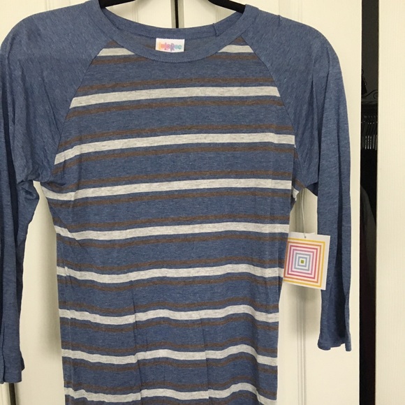 NWT Lularoe Randy, blue/gray/white striped body, blue sleeves.