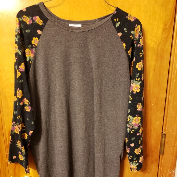 Gorgeous baseball style top, charcoal grey torso with floral sleeves. This top has only been worn a handful of times and is in like new condition. No known flaws or fading. The flowers, in my opinion, are more muted than the picture shows, but my lighting was being stubborn. Stretchy and lightweight!