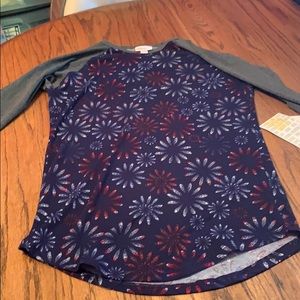 Grey three quarter length sleeve Lularoe Randy with fireworks 🧨 can be worn with jeans or leggings