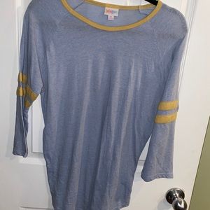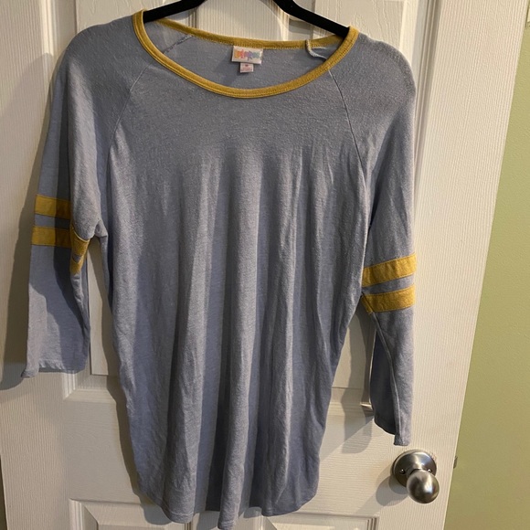 Super cute baseball like tee. The lularoe Randy. Runs true to size. Small tiny hole in sleeve (see photo). Great condition with lots of life left. Smoke free home. Feel free to ask questions or make an offer. Willing to make discount bundles. Be sure to check out my other items!!