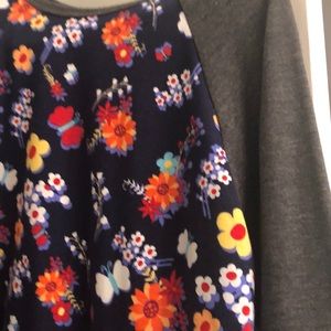 Lularoe Randy, sz large. T-shirt feel, dark grey sleeves multi-color print, navy background.
