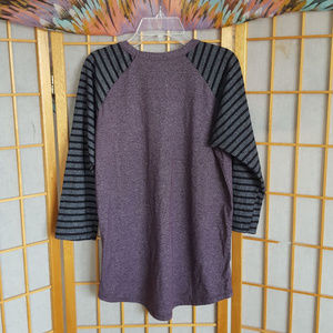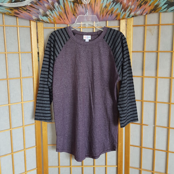 Lularoe Heathered burgundy/wine with grey & black striped sleeve Randy shirt. This is a fall favorite, flattering tunic that covers the bum! Size: Small, see Lularoe size chart for size comparison. Preloved, gently used condition. Please look at photos that represent condition. Smoke-free home. No Trades