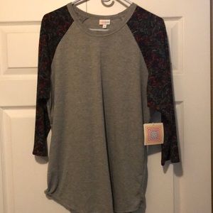 Lularoe Randy T with a heathered gray body and a gorgeous floral, paisley-like pattern on a 3/4 length sleeve. Colors include deep red, purple, sage green and tan. Brand new, never worn.