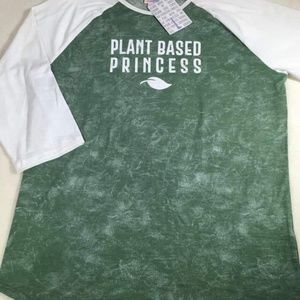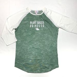 Lularoe size large Randy baseball T. Plant based princess graphic. White Quarter sleeves with green body.