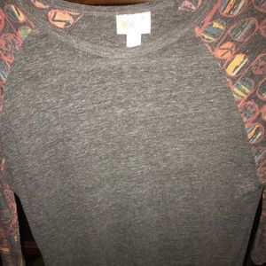 Gray Lularoe Randy baseball tee with a colorful design on the arms.