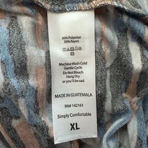 Lularoe Randy Tee size XL. Super soft and lightweight with 50% Rayon, my favorite material 😊 Heathered look with gray arms and blue and orange colors on the body. Arms are quarter length.