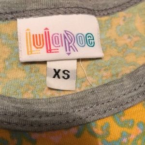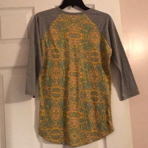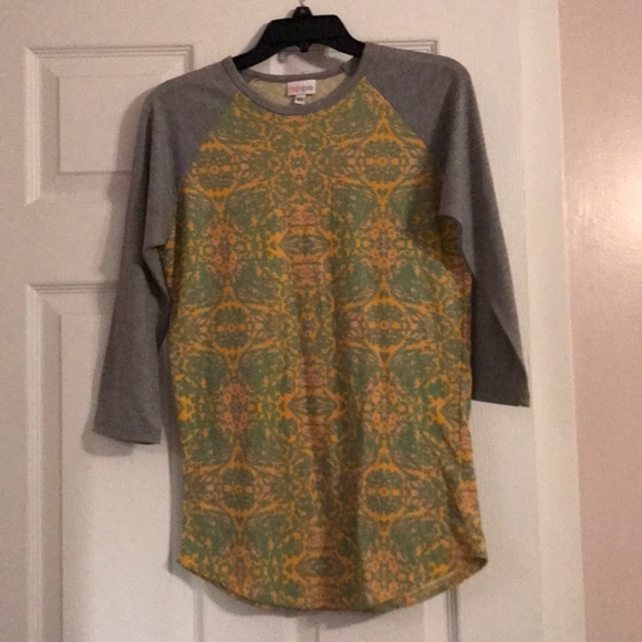 Lularoe Randy. Yellow, blue, and green design body. Grey sleeves.