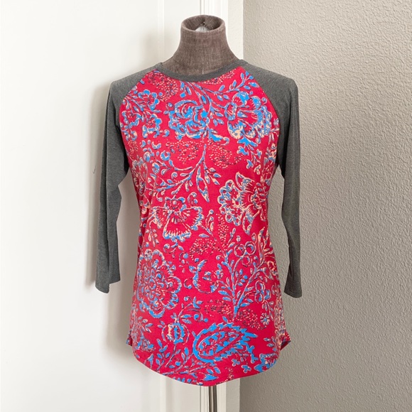 Never Worn. Size small. The Randy is a unisex knit tee with raglan, mid-length sleeves — in a contrasting, patterned fabric.