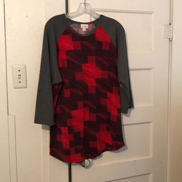 Black red and dark gray randy tee. Worn once. Lularoe baseball tee. Most people size up one to two sizes from their dept store size for the randy. This particular one though runs even smaller. If you are normally a large or even a medium. You could wear this one! So cute. I’ll get measurements if needed. 3/4 sleeve.