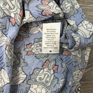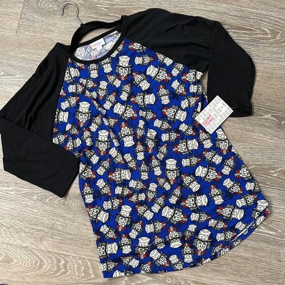 Black sleeves with blue bodice, “Uncle Sam” heads on body of shirt.