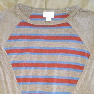 Slinky, jersey material. Gray with red and blue horizontal stripes. Worn once. Very stretchy and comfy!