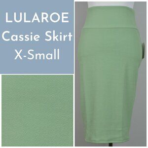 This listing is for a brand-new with tags Cassie skirt by LuLaRoe. This is a pencil skirt that has a waistband that is flattering for many body types. It is a knee-length skirt; however, fold over the waistband if you want to show a bit more leg. The skirt is a solid sage green color. The size is X-Small. Dress it up with heels and an elegant top for a night out or pair it with a t-shirt and sneakers for a fun weekend look.